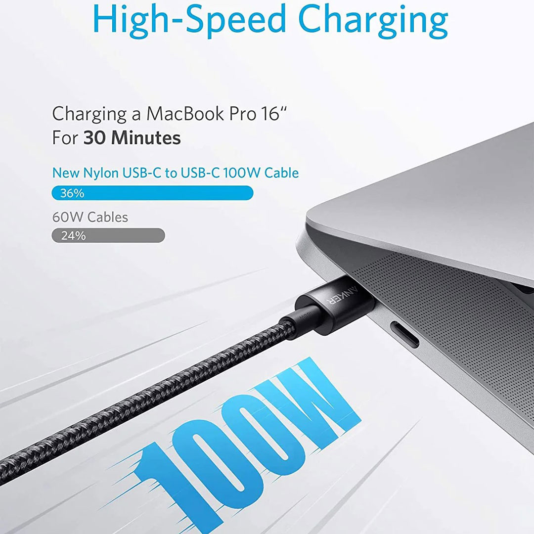 • With a max output of 100W, this cable can charge anything from phones to laptops. Pair with a 100W USB-C Power Delivery charger to power up a MacBook Pro 16ʺ in just 2 hours.