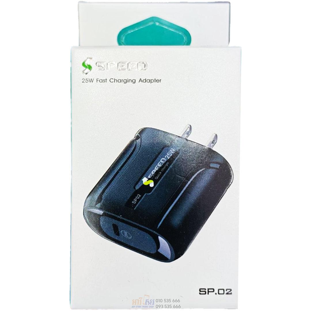 - Speed brand 25W Fast Charging Adapter, model SP.02, designed for quick charging of mobile devices.Ā